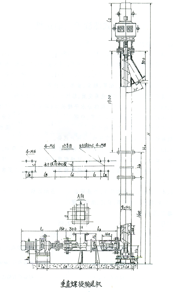 2、LC型立式螺旋輸送機分水平槽機體(即喂料螺旋槽機體)垂直機體兩部分。垂直機體分頭節(jié)、中間節(jié)、尾節(jié)三部分,每一部分又有集中不同規(guī)格的長度依機高選擇,可組成3~15m不同高度的整機,螺旋機每增加0.5m為一高度規(guī)格,供用戶選擇。